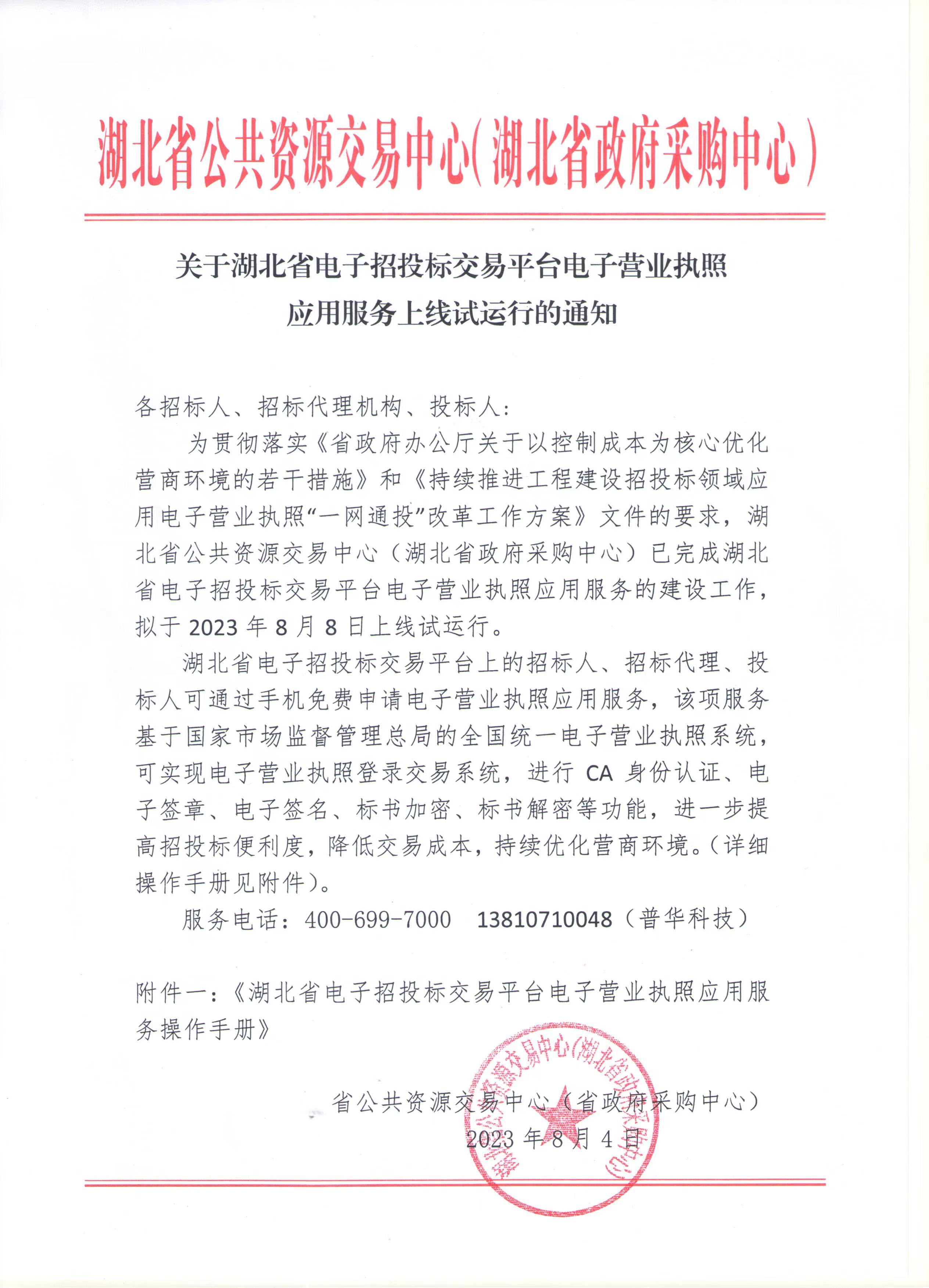 为贯彻落实《省政府办公厅关于以控制成本为核心优化营商环境的若干措施》和《持续推进工程建设招投标领域应用电子营业执照“一网通投”改革工作方案》文件的要求,湖北省公共资源交易中心(湖北省政府采购中心)已完成湖北省电子招投标交易平台电子营业执照应用服务的建设工作,拟于2023年8月8日上线试运行。