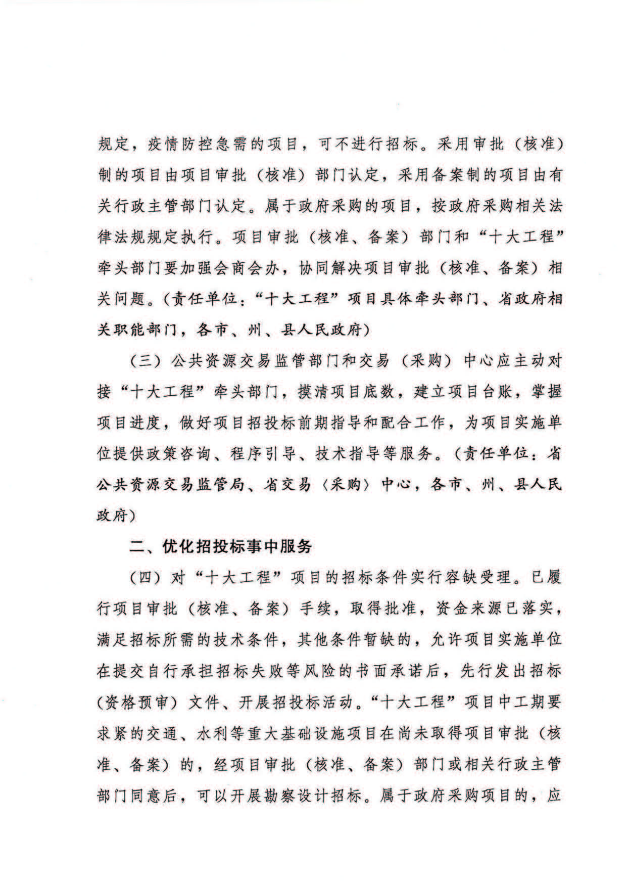 | 3 | 对“十大工程”项目的招标条件实行容缺受理。属于政府采购项目的,应明确预算,保证款项支付。 | 饶建国 | 交易受理处 |