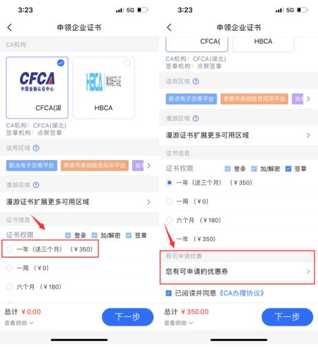 办理手机版CA(标证通)200元优惠券领取操作流程