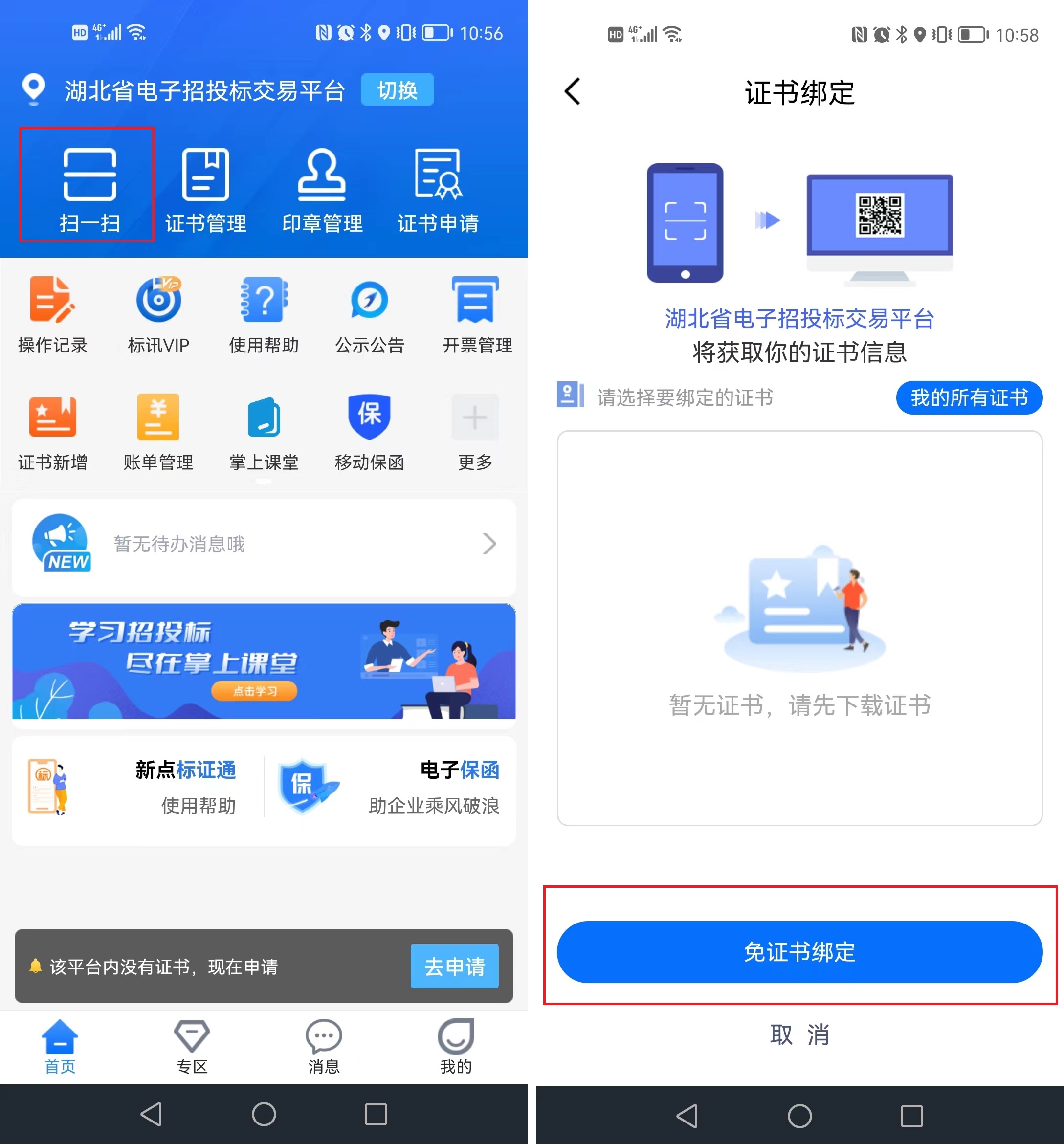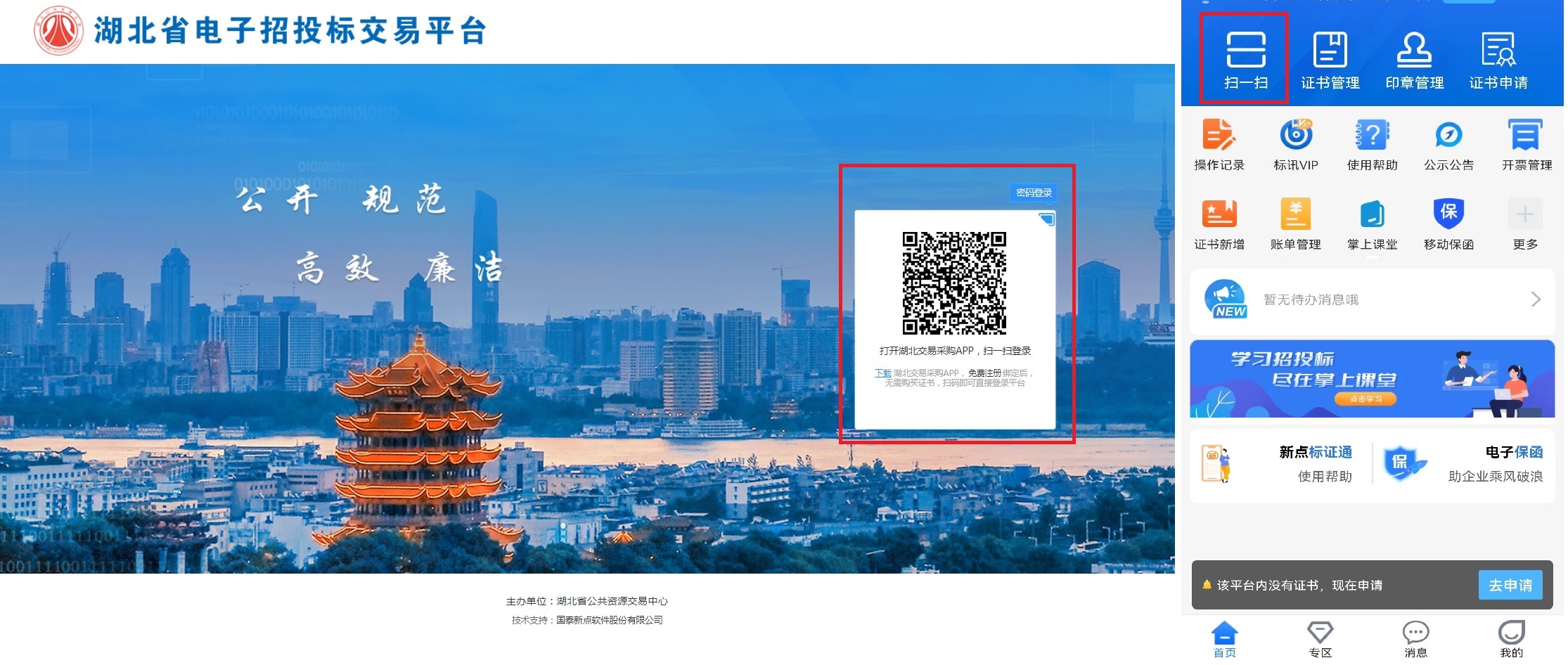 完成免证书绑定后,点击湖北交易采购APP的【扫码签章】或者点击标证通APP的【扫一扫】,扫描电脑端登录页码的二维码,即可告别传统介质CA,实现手机扫码登录。
