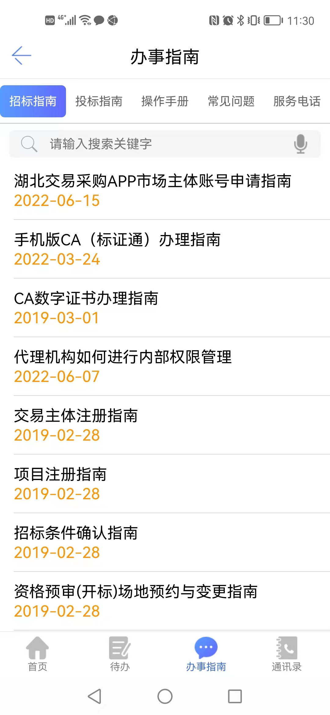 在首页下方通过点击“办事指南”,进入办事指南页面,点击各个栏目“招标指南”、“投标指南”、“操作手册”、“常见问题”或“服务电话”,即可查阅各个栏目内容。如下图: