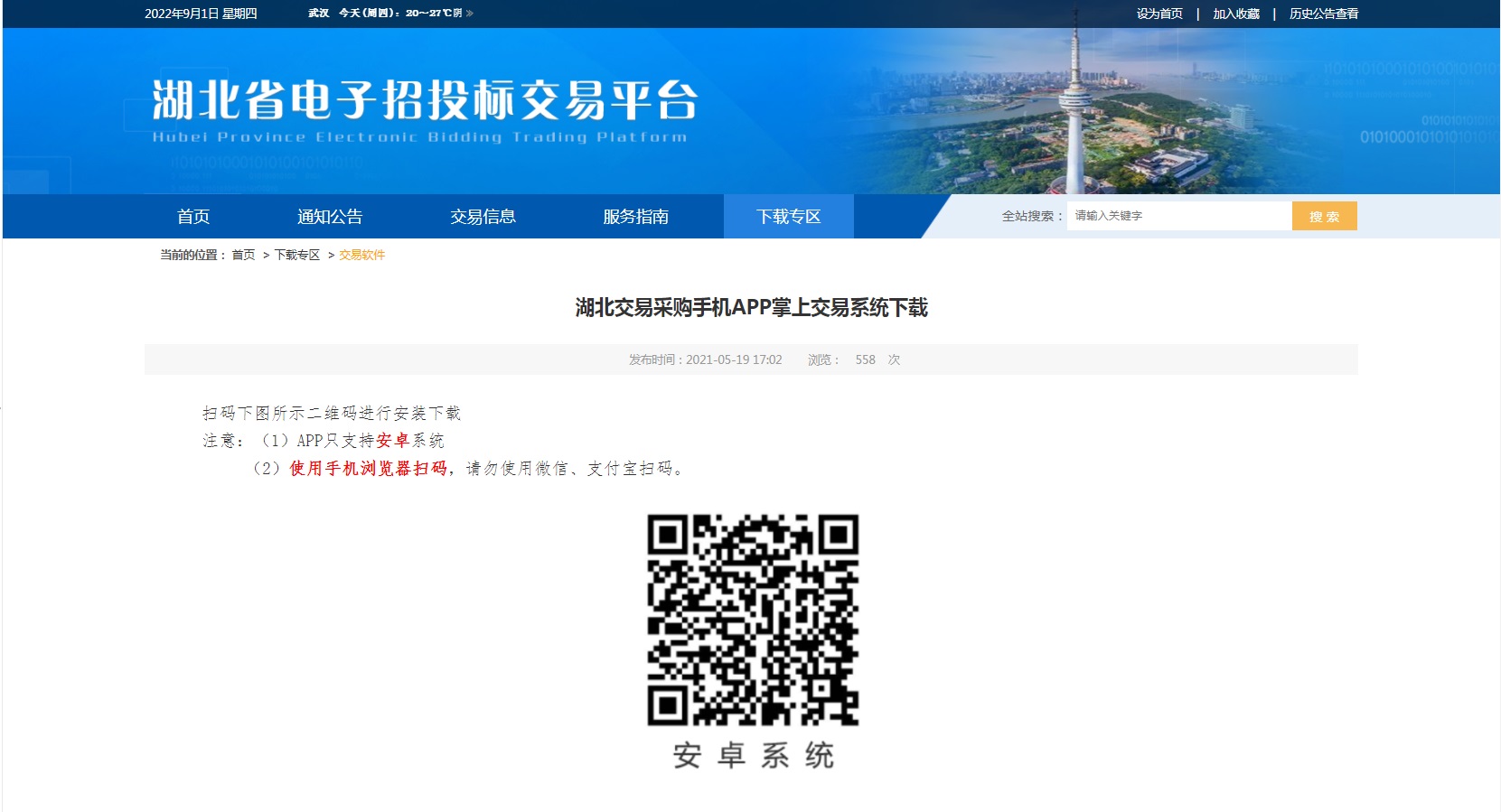 目前,湖北交易采购APP仅支持安卓系统手机安装,安装地址如下: