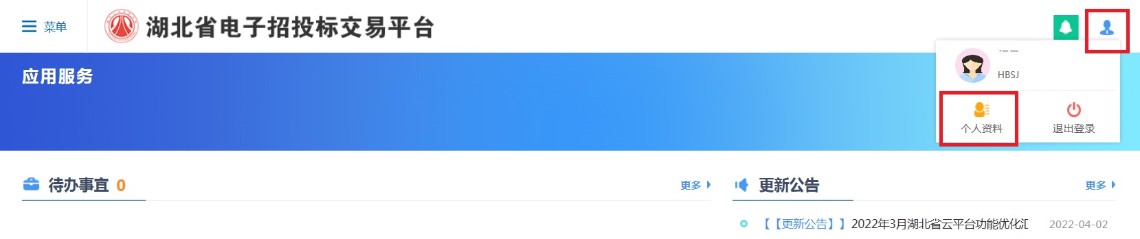 用户先登录到PC端湖北省电子招投标交易平台,点击右上角【个人资料】-【个人信息】,完善【基本信息】中的“移动电话”,该电话号码将作为【湖北交易采购APP】的登录账号。如果不填写,将无法登录使用【湖北交易采购APP】。