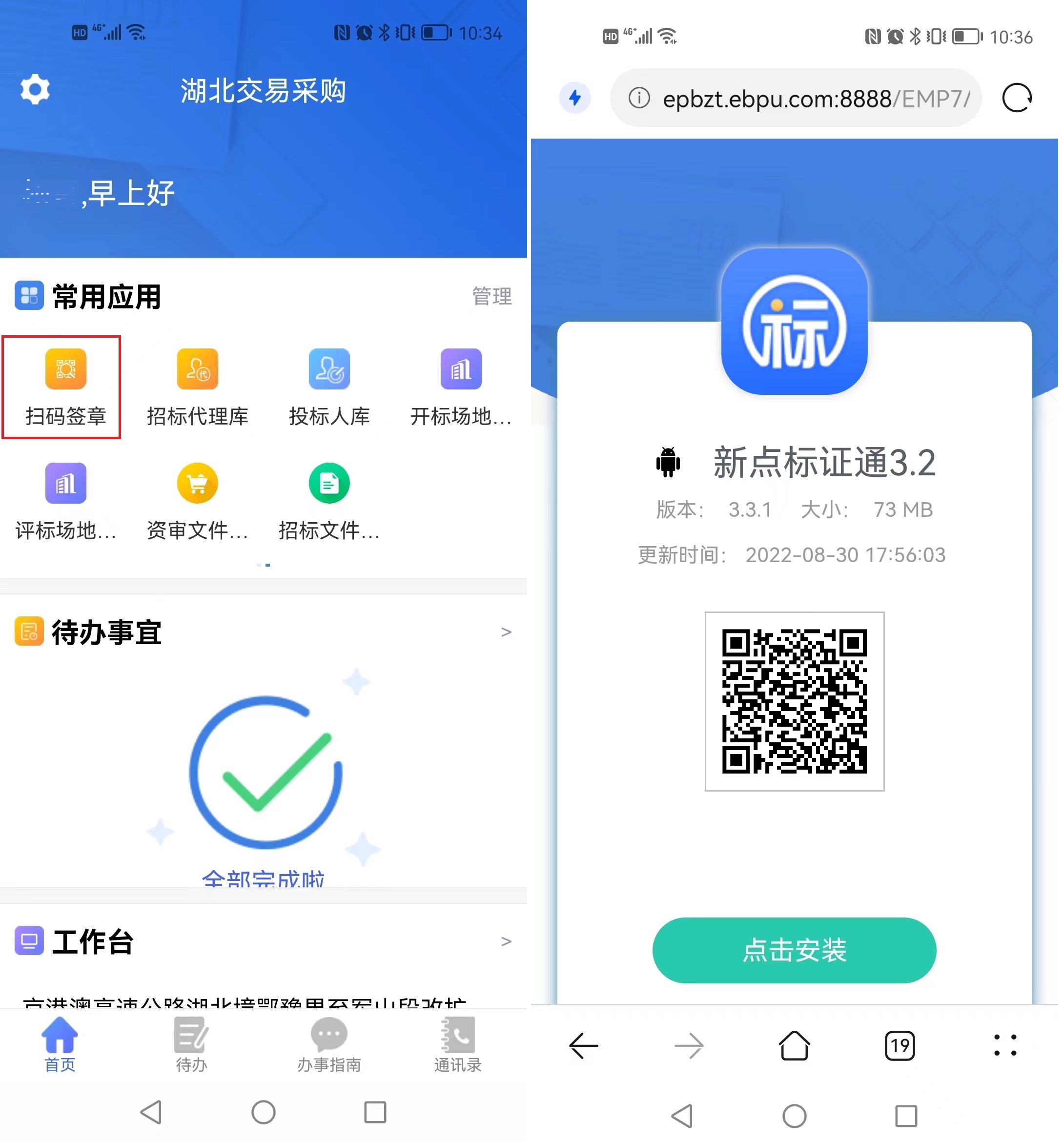 安装方式一:在湖北交易采购APP主页面中,点击【扫码签章】模块,系统自动提示并下载安装标证通。