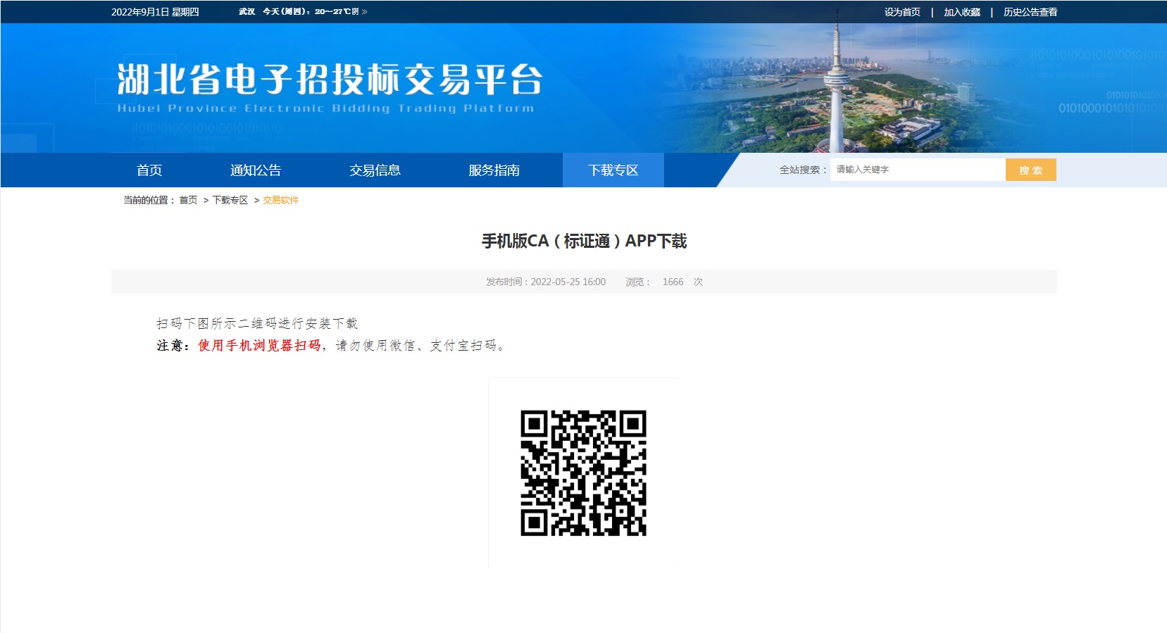 安装方式二:湖北省电子招投标交易平台网站首页(http://www.hbbidcloud.cn/hubei/)—下载专区—交易软件—手机版CA(标证通)APP下载 —使用手机浏览器扫码下载安装即可。