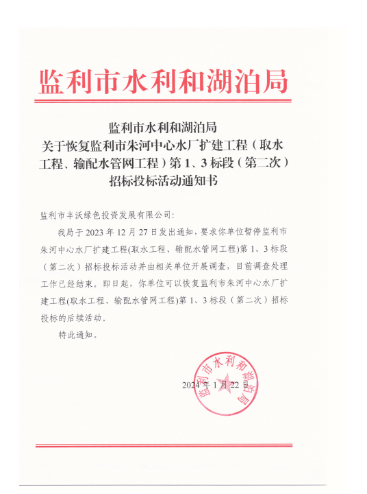 监利市朱河中心水厂扩建工程(取水工程、输配水管网工程)第1标段监利市朱河中心水厂扩建工程取水趸船建造、机电设备及安装(第二次)项目于2023年12月28日发布暂停公告。现异议已处理完结,按行业主管部门监利市水利和湖泊局要求,决定恢复该项目招标投标活动。