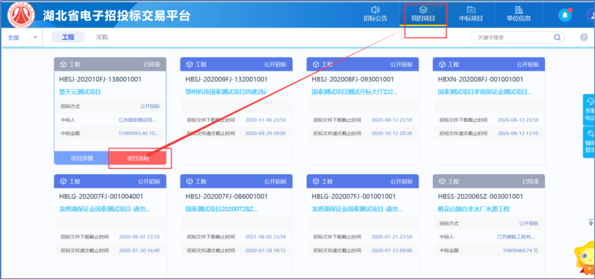 投标单位登录到湖北省电子招投标交易平台,点击【我的项目】