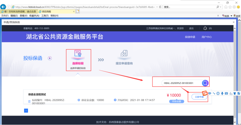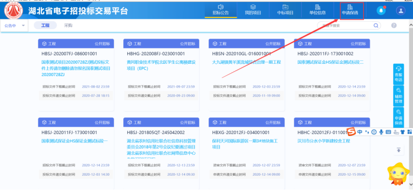 1、投标单位登录到湖北省电子招投标交易平台,点击【申请保函】,即可申请电子保函。