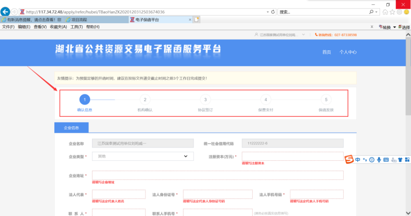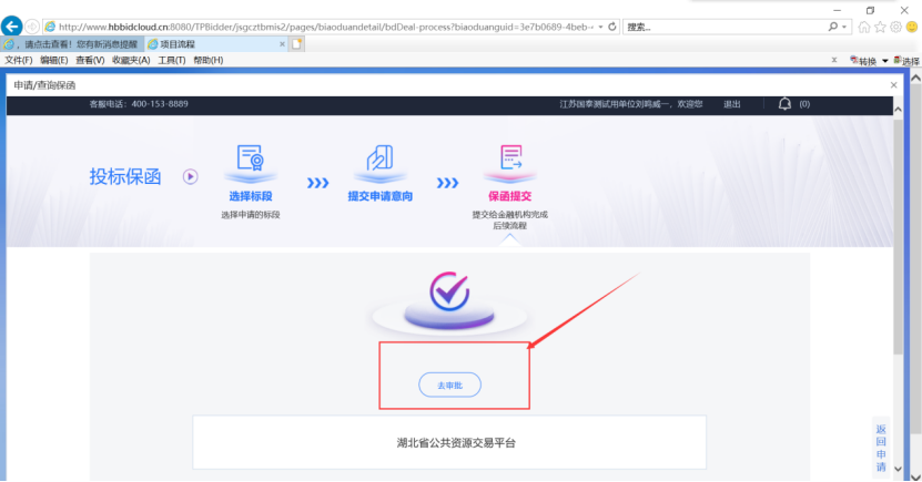 4、点击【去审批】,进行单位信息的填写,【确认信息】—【机构确认】—【协议签订】—【保费支付】,等待电子保函发放。