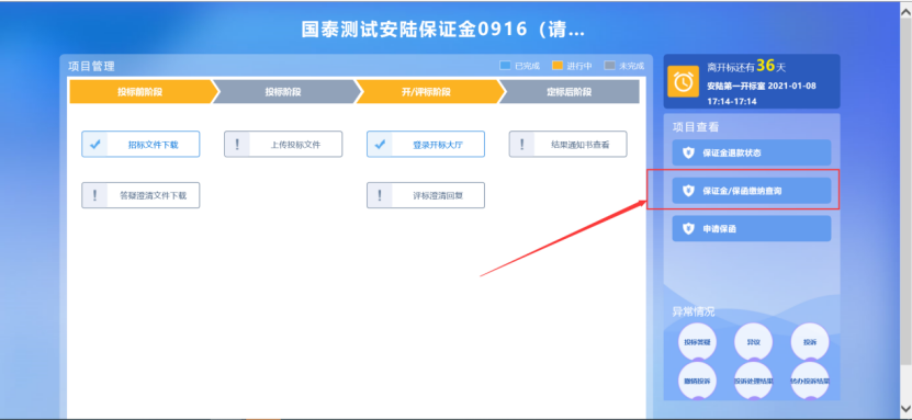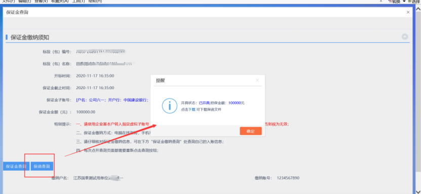 1、登录交易平台后,在【我的项目】中进入标段,点击【保证金/保函缴纳查询】-【保函查询】,即可查看开具状态、担保金额,点击【下载】可下载保函文件。