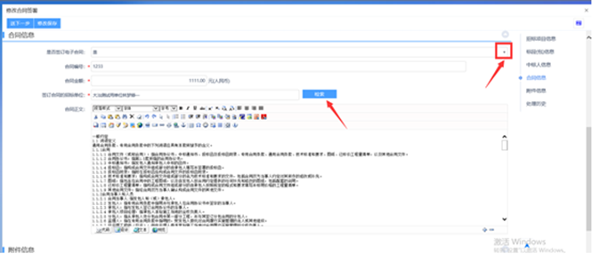 2、是否签订电子合同(选“是”)-填写合同编号、合同金额、合同正文、检索签订合同的招标单位即可