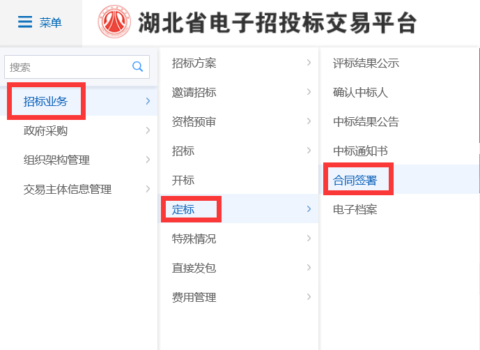 1、 招标人登入业务系统-菜单-招标业务-定标-合同签署