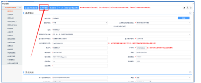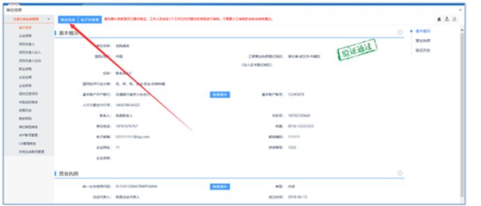 1、 市场主体登入到业务系统会员端后,点击页面右上角【单位信息】
