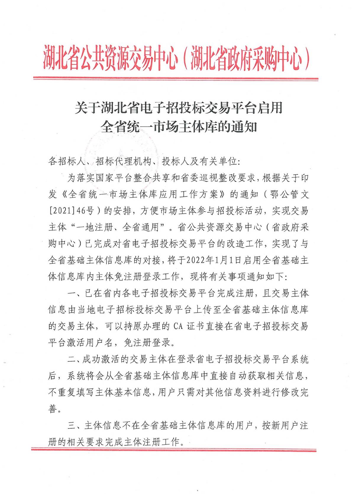 关于湖北省电子招投标交易平台启用全省统一市场主体库的通知