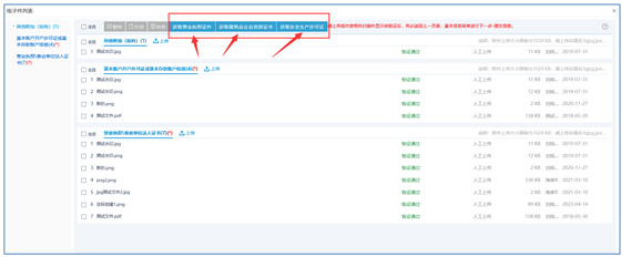 4、进入电子件列表页面,依次点击【获取营业执照证件】、【获取建筑业企业资质证书】、【获取安全生产许可证】即可