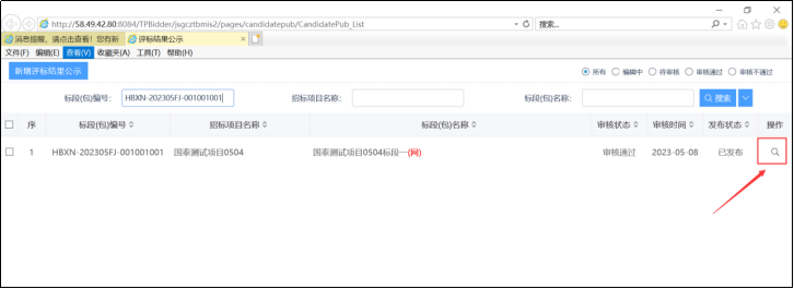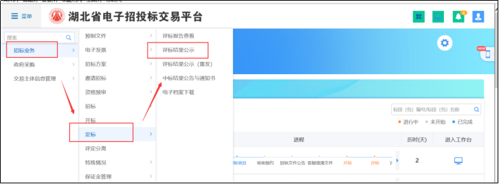 1、招标代理登录到湖北省电子招投标交易平台,点击【招标业务】-【定标】-【评标结果公示】菜单,根据“标段编号”或“标段名称”进行项目搜索,并点击【操作】按钮。