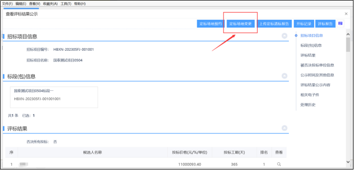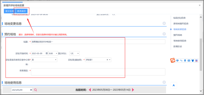 3、填写标题,选择定标开始时间及其定标场地等。填写完成后,修改保存并提交信息。提交成功后,即定标场地变更成功。