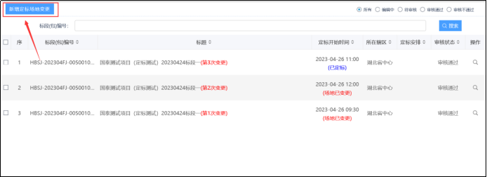 2、点击【定标场地变更】按钮,再点击【新增定标场地变更】按钮,确定选择需要变更定标场地的项目。