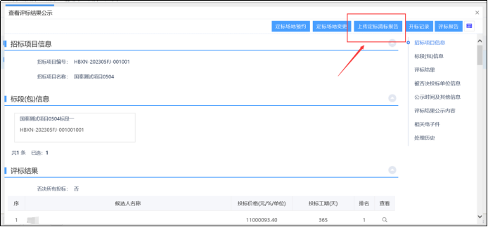 招标代理上传定标清标报告前提条件:项目为评定分离项目,且评标结果公示发布并审核通过。
