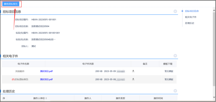 如若提交成功后需要修改定标清标报告的,可点击【撤销清标报告】按钮进行修改,再重新提交。
