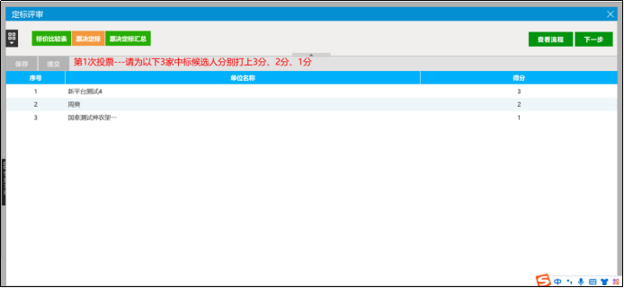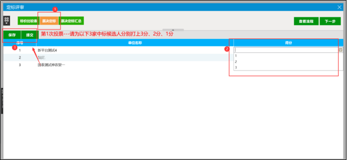 (2)点击【票决定标】按钮,评委需对各定标候选人单位进行投票打分,选择得分,并保存提交。