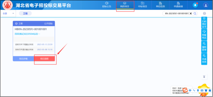 1、投标单位登录到湖北省电子招投标交易平台,点击【我的项目】-【项目流程】。